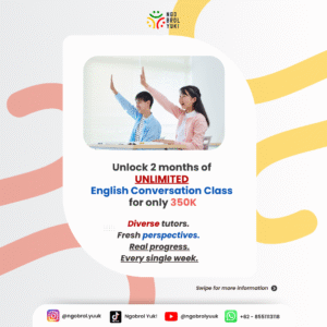 Kelas privat di Ngobrol Yuk menawarkan pengalaman belajar yang sepenuhnya disesuaikan dengan kebutuhan dan tujuan pribadi peserta. Dalam kelas ini, jadwal belajar lebih fleksibel dan dapat diatur berdasarkan kesepakatan antara peserta dan pengajar. Dengan system One on One dengan tutor, murid mendapatkan perhatian penuh, sehingga proses belajar menjadi lebih efektif dan fokus pada topik atau keterampilan tertentu yang ingin dikembangkan. Durasi per sesi juga dapat disesuaikan, memberikan kenyamanan dan hasil yang maksimal bagi peserta. Kelas privat ini cocok untuk kamu yang menginginkan pengalaman belajar yang personal dan fleksibel.