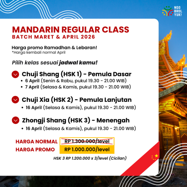 Jika kamu ingin belajar Mandarin dengan sistem yang jelas, tutor berpengalaman, dan progres yang benar-benar terasa, kelas reguler ini adalah fondasi yang aman untuk memulai. Kamu tidak perlu lagi bingung bertanya sedang ada di level mana atau harus lanjut ke mana.