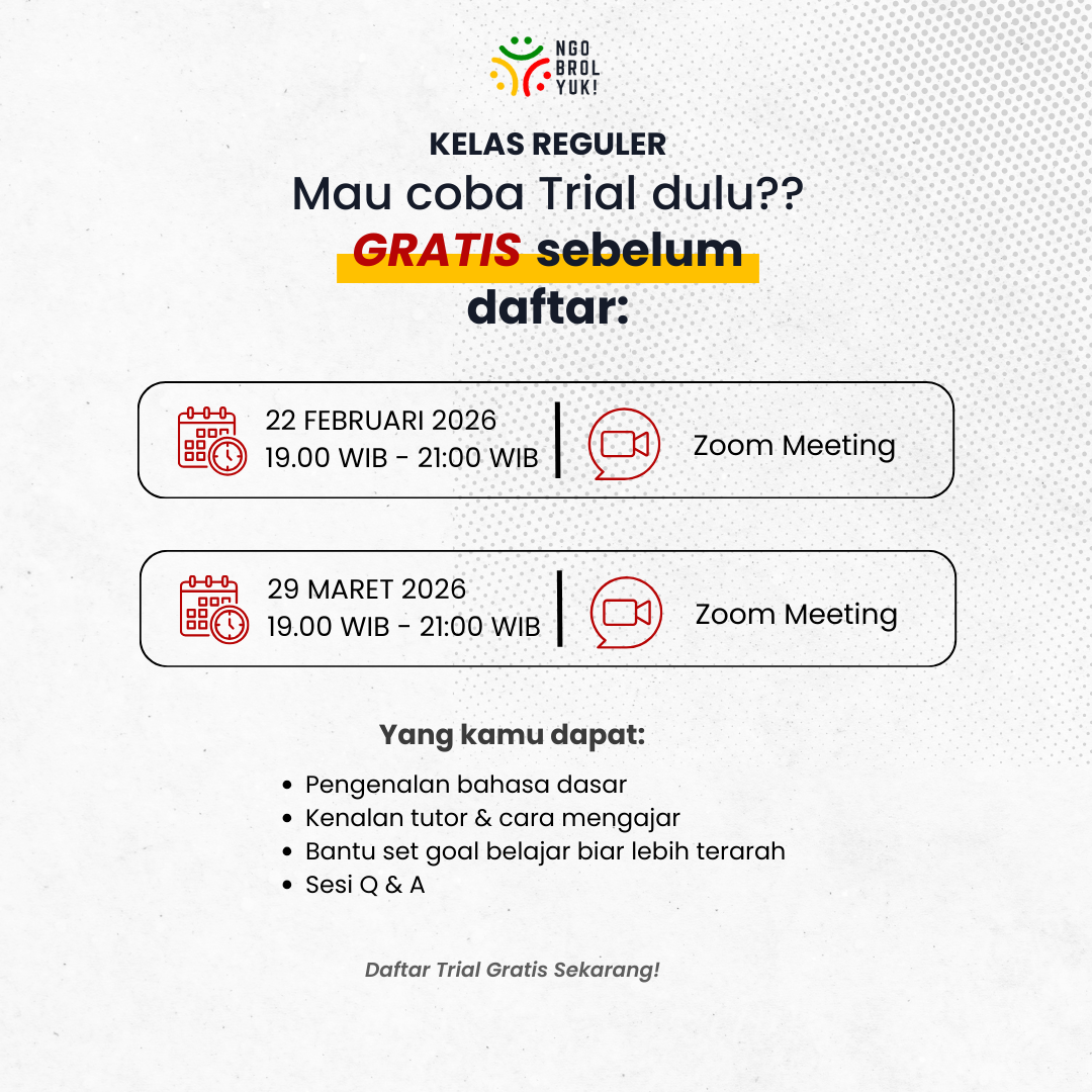 Kelas reguler dibuka per batch dan kuota terbatas. Jika kamu ingin mulai dari nol, pilih A1.1 sebagai starting point.